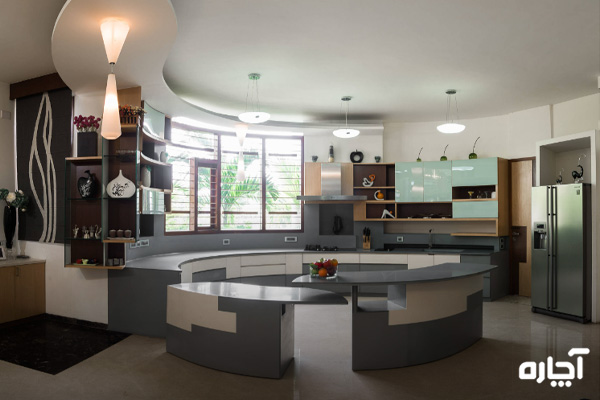 جزیرهی آشپزخانه را به یک پارتیشن زیبا تبدیل کنید. شما میتوانید با تعبیهی پارتیشن آشپزخانه را به دو بخش تقسیم کنید یا آشپزخانه را از نشیمن تفکیک کنید. شما به صورت هنرمندانهای تفکیک فضاها را انجام دادهاید. این تصویر گویای ماجراست. یک جزیرهی منحنی شکل در امتداد دیوارهای منحنی شکل آشپزخانه کشیده شده است. در حقیقت، جزیره وظیفهی تکمیل دایره را داشته است. این موضوع موجب القای حس تفکیک میشود. گویی یک دیوار نصف فضای نشیمن را از آشپزخانه جدا کرده است.